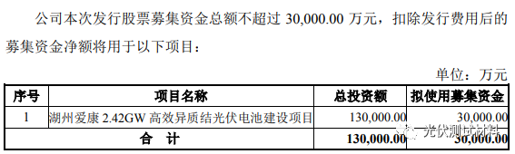 4月24日,愛康科技發(fā)布公告稱,公司擬向特定對象發(fā)行股票募資不超過3億元,扣除相關(guān)發(fā)行費用后用于湖州愛康2.42GW高效異質(zhì)結(jié)光伏電池建設(shè)項目。