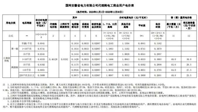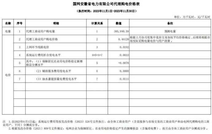近日,安徽電網(wǎng)有限責(zé)任公司公布了安徽省2023年11月電網(wǎng)代理購電價格,為0.46128元/千瓦時,環(huán)比上月持平。