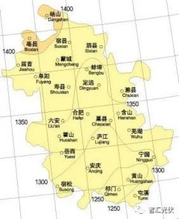 根據(jù)中國氣象局?jǐn)?shù)據(jù),2022年,安徽省全境平均水平面年總輻射量為1502.8kWh/㎡,最佳傾角總輻射量為1636kWh/㎡。若按照82%的系統(tǒng)效率計算,首年年利用小時數(shù)可達(dá)1340小時。