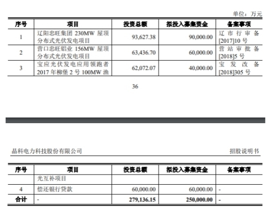 晶科科技發(fā)行募集資金總額為25.98億元,募集資金凈額為24.17億元。晶科科技最終募集資金凈額比原計劃少8324.30萬元。2020年4月25日,晶科科技披露的招股說明書顯示,公司擬募集資金25.00億元,分別用于遼陽忠旺集團230MW屋頂分布式光伏發(fā)電項目、營口忠旺鋁業(yè)156MW屋頂分布式光伏發(fā)電項目、寶應光伏發(fā)電應用領(lǐng)跑者2017年柳堡2號100MW漁光互補項目、償還銀行貸款。
