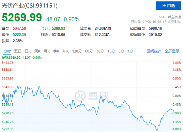 7月6日,光伏板塊迎來(lái)分化行情,中證光伏產(chǎn)業(yè)指數(shù)(CSI:931151)早盤(pán)在金剛線(xiàn)、組件、逆變器、設(shè)備個(gè)股的帶動(dòng)下創(chuàng)出近期反彈新高,隨后硅料、硅片個(gè)股震蕩下跌,拖累指數(shù)盤(pán)中跌幅一度達(dá)到1.78%。截至收盤(pán),中證光伏產(chǎn)業(yè)指數(shù)報(bào)收5270點(diǎn),跌幅收窄至0.9%。