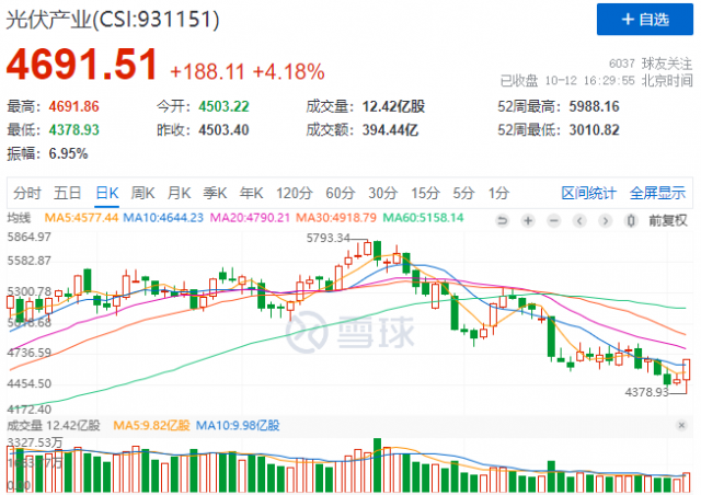 10月12日,早盤全線跳水的光伏板塊午后“遭”暴力拉升,中證光伏產(chǎn)業(yè)指數(shù)(CSI:931151)大漲4.18%,全日振幅高達(dá)6.95%,個股紛紛走出“金針探底”形態(tài)。