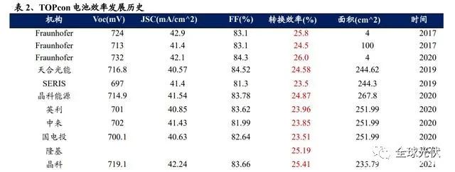 發(fā)展歷史:2013 年德國 Fraunhofer 研究所在 N 型 PERT 結(jié)構(gòu)基礎(chǔ)上,首次提 出 TOPCon 結(jié)構(gòu);2017 年 Fraunhofer 研究所在實驗室 TOPcon 電池上取得 25.8% 的效率記錄;2019 年,天合光能在面積為 244.62 平方厘米的 n 型襯底上制備出 正面最高效率為 24.58%的實驗室電池,并獲德國哈梅林太陽能研究所(ISFH) 下屬的檢測實驗室認證,同年,天合光能 i-TOPCon 雙面電池大規(guī)模量產(chǎn)正面平 均轉(zhuǎn)換效率突破 23%。2021 年,晶科能源 TOPcon 電池在權(quán)威第三方測試認證機 構(gòu)日本 JET 檢測實驗室標(biāo)定全面積電池最高轉(zhuǎn)化效率達到 25.4%,成為商業(yè)化全 面積電池效率記錄的保持者,為后續(xù)的 N 型 TOPCon 電池的擴產(chǎn)奠定基礎(chǔ)。