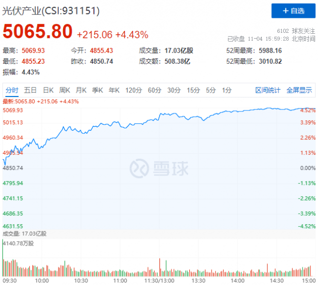 11月4日,光伏板塊全線大漲,中證光伏產(chǎn)業(yè)指數(shù)(CSI:931151)報收5066點,漲幅達到4.43%。