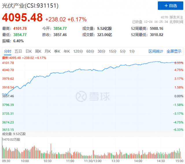 12月25日,近期持續(xù)下跌的光伏板塊迎來報復(fù)性反彈,中證光伏產(chǎn)業(yè)指數(shù)(CSI:931151)暴漲6.17%,報收4095點。其中,膠膜、儲能、逆變器、HJT、組件概念漲幅居前。