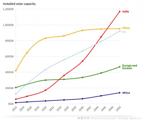 近年來(lái),印度光伏市場(chǎng)發(fā)展迅速,光伏裝機(jī)始終保強(qiáng)勁增長(zhǎng)。截至2023年6月30日,印度可再生能源發(fā)電的累計(jì)裝機(jī)容量達(dá)到129.6GW,太陽(yáng)能約占可再生能源總裝機(jī)容量的54%。美國(guó)能源信息署(IEA) 《國(guó)際能源展望》報(bào)告預(yù)測(cè)稱,至2050年,印度的太陽(yáng)能裝機(jī)容量將在全球占據(jù)主導(dǎo)地位。