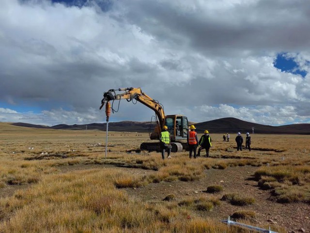 在西藏華電那曲色尼區(qū)12萬千瓦光伏發(fā)電電力保供項目工地,工人們正安裝螺旋樁。