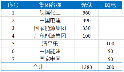 從投資企業(yè)來(lái)看,共7家企業(yè)獲得項(xiàng)目指標(biāo),其中:陜煤化工、中國(guó)電建、國(guó)家能源集團(tuán)三家均獲得300MW以上。具體如下表所示。