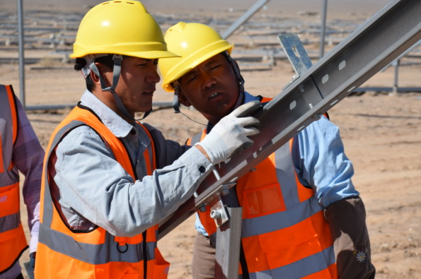 在樁基施工過程中,克服作業(yè)面環(huán)境惡劣、氣溫高紫外線強、常伴有沙塵暴等因素,以每日、每周為節(jié)點嚴格落實施工部署,優(yōu)化工序施工方案,采取測量放點精準定位,樁位中心清晰標識,樁機安裝水平尺,專人盯控預(yù)埋件,有效避免樁位、樁身垂直度、樁長、樁頂標高、預(yù)埋件定位等工序風險點出現(xiàn),5月27日優(yōu)質(zhì)完成樁基混凝土澆筑,為項目安全快速推進奠定了堅實的基礎(chǔ)。8月12日,玉門40萬千瓦光伏發(fā)電工程項目首批次光伏板順利安裝,項目正式進入電氣安裝階段,同時開啟了建設(shè)目標“加速度”。10月30日項目提前40天順利完工。