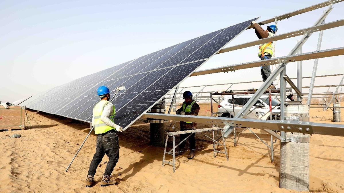 記者在35萬(wàn)千瓦新增負(fù)荷消納光伏發(fā)電項(xiàng)目建設(shè)現(xiàn)場(chǎng)看到,一排排光伏板連線成片,宛如藍(lán)色的海洋,向戈壁深處不斷延伸,呈現(xiàn)出一派蓬勃發(fā)展的新氣象。項(xiàng)目業(yè)主單位和建設(shè)單位全力組織技術(shù)人員和工人,按照一季度項(xiàng)目施工進(jìn)度計(jì)劃,分片區(qū)、分方陣進(jìn)行光伏支架和光伏組件安裝。目前,110個(gè)發(fā)電方陣、67萬(wàn)塊組件以及相關(guān)設(shè)施的施工正有序進(jìn)行中。