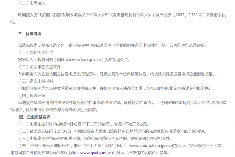 要求申報企業(yè)截至到2021年12月31日,在內(nèi)蒙古自治區(qū)持有已并網(wǎng)運行的光伏項目裝機規(guī)模不低于50MW。