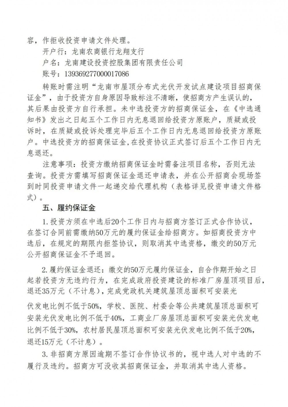 根據(jù)公告,本次招商項(xiàng)目總投資約20億元,首期投資約3億元。建設(shè)內(nèi)容為龍南市內(nèi)黨政機(jī)關(guān)、學(xué)校、醫(yī)院、村委會(huì)、工業(yè)園區(qū)廠房和農(nóng)村房屋屋頂光伏開發(fā)。通過招商方式引進(jìn)投資方負(fù)責(zé)項(xiàng)目建設(shè)及運(yùn)營(yíng)。龍南建設(shè)投資控股集團(tuán)有限責(zé)任公司將可以建設(shè)光伏電站的所有屋頂以租賃方式租賃給投資方建設(shè)分布式光伏電站,若招商方需要?jiǎng)t共同投資,另行約定。投資方負(fù)責(zé)項(xiàng)目全部投資,包含但不限于建設(shè)期間的設(shè)計(jì)、設(shè)備采購、安裝、調(diào)試、驗(yàn)收等費(fèi)用以及運(yùn)營(yíng)期間的管理、維護(hù)等費(fèi)用。