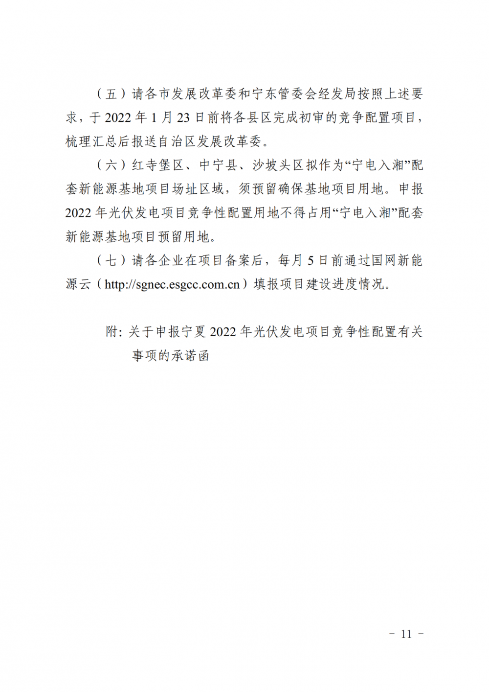 紅寺堡區(qū)、中寧縣、沙坡頭區(qū)擬作為“寧電入湘”配套新能源基地項(xiàng)目場址區(qū)域,須預(yù)留確?;仨?xiàng)目用地。申報(bào)2022年光伏發(fā)電項(xiàng)目競爭性配置用地不得占用“寧電入湘”配套新能源基地項(xiàng)目預(yù)留用地。