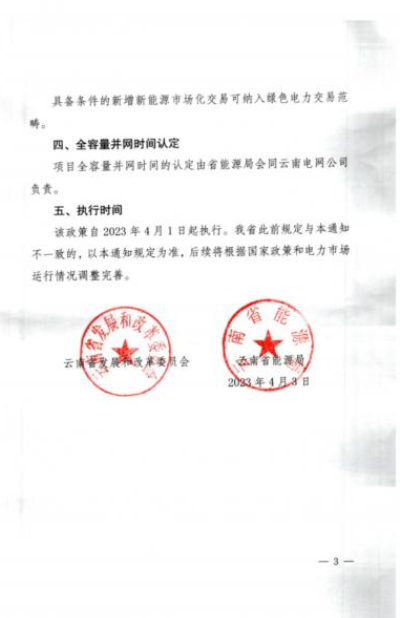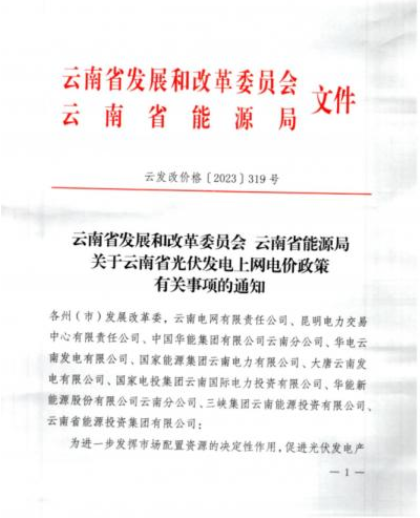 4月3日,云南省發(fā)展和改革委員會、云南省能源局發(fā)布了《關于云南省光伏發(fā)電上網(wǎng)電價政策有關事項的通知》。該政策自2023年4月1日起執(zhí)行。通知顯示,為進一步發(fā)揮市場配置資源的決定性作用,促進光伏發(fā)電產(chǎn)業(yè)健康有序發(fā)展,提升能源保供能力,云南省對新增合規(guī)光伏發(fā)電項目全電量納入市場統(tǒng)籌。
