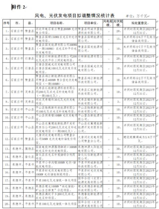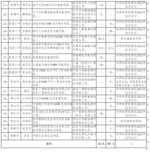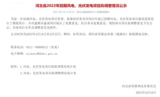 4月18日,河北省發(fā)改委對(duì)2022年到期風(fēng)電、光伏發(fā)電項(xiàng)目擬調(diào)整情況進(jìn)行公示。公示表示,為進(jìn)一步加強(qiáng)風(fēng)電、光伏發(fā)電項(xiàng)目管理,對(duì)2022年底已到期風(fēng)電、光伏發(fā)電項(xiàng)目建設(shè)進(jìn)度進(jìn)行了摸底統(tǒng)計(jì),并對(duì)逾期未建成項(xiàng)目提出了處置意見(jiàn)。其中,擬取消8個(gè)風(fēng)電、光伏發(fā)電項(xiàng)目,規(guī)模合計(jì)388MW;風(fēng)電、光伏發(fā)電項(xiàng)目擬調(diào)整37個(gè),規(guī)模合計(jì)4484MW,其中,光伏項(xiàng)目3816MW。
