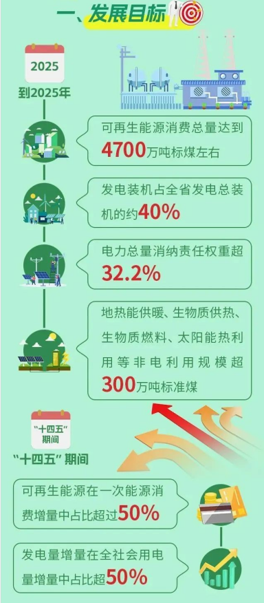 ——可再生能源發(fā)電目標(biāo)。2025年,可再生能源發(fā)電裝機達(dá)到5500萬千瓦以上,占全省發(fā)電總裝機的40%左右;可再生能源年發(fā)電量達(dá)到1000億千瓦時左右?!笆奈濉逼陂g,可再生能源發(fā)電量增量在全社會用電量增量中的占比超過50%。