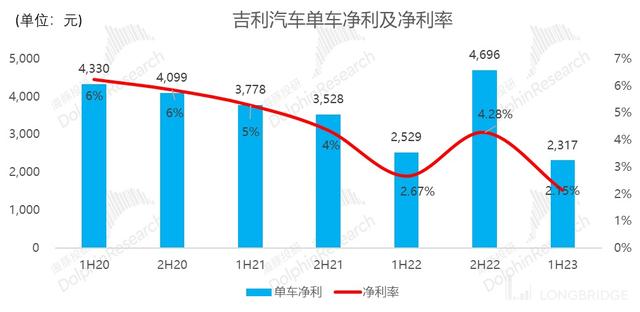 2023 年上半年吉利汽車實現(xiàn)歸母凈利潤 15.7 億元,同比增長約 1%,略超市場預期 15.1 億元。但凈利率下滑從 2022 年上半年 2.7% 下滑至 2023 年上半年 2.2%, 單車凈利也從 2529 元降低至 2317 元。