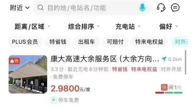 2月1日,瀟湘晨報(bào)記者登錄特來(lái)電App搜索大余服務(wù)區(qū)充電樁時(shí)看到,標(biāo)價(jià)是1.8元/度,并不是網(wǎng)傳截圖的2.98元。