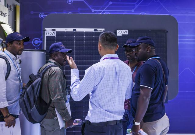 4月15日,參展商在第135屆廣交會(huì)上向采購(gòu)商介紹太陽(yáng)能電池組件展品。新華社記者劉大偉攝