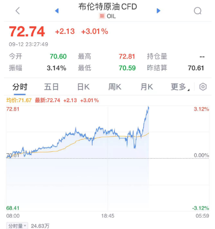 美東時間9月12日,國際油價暴漲,WTI原油日內漲超3.5%,布倫特原油漲超3%。