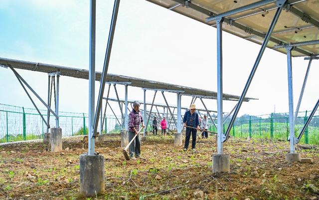 ▲6月25日,墊江縣硯臺鎮(zhèn)太安村農(nóng)光互補(bǔ)發(fā)電站,村民在光伏板下管理黃精、黃豆苗。記者 齊嵐森 攝