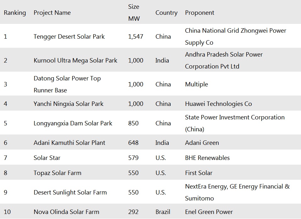 根據(jù)IEEFA的統(tǒng)計(jì),全球最大的經(jīng)營實(shí)用規(guī)模的太陽能項(xiàng)目集中在中國和印度,包括: