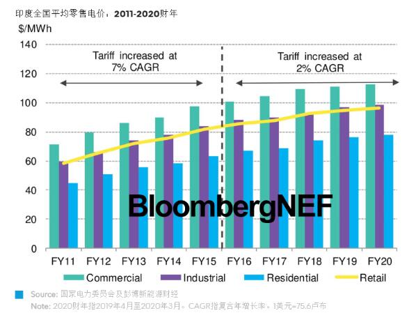 印度的商業(yè)電價是各類電價中最高的, 商業(yè)電價平均達112美元/兆瓦時,比居民電價和工業(yè)電價分別高44%和14%。