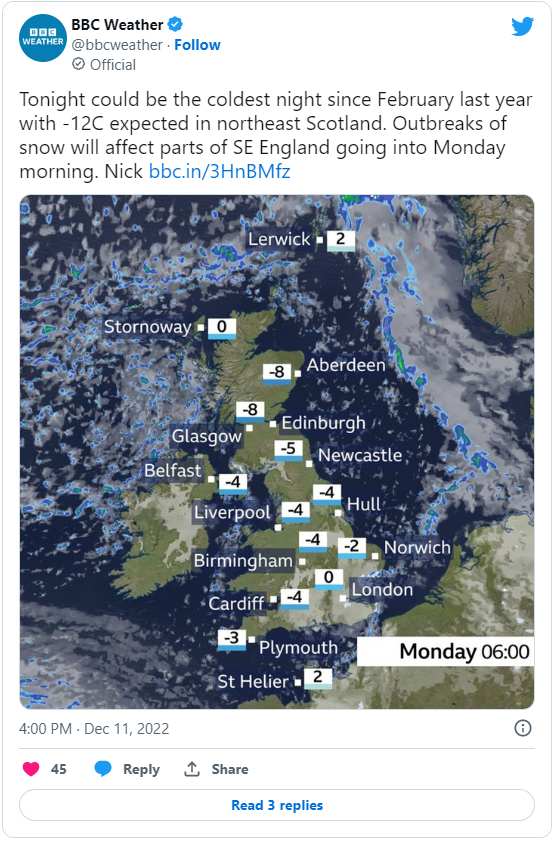 據(jù)了解,英國(guó)氣象局在上周四之前發(fā)布了黃色冰雪天氣預(yù)警,而到上周日晚上,倫敦的氣溫將降至零下3攝氏度(26.6華氏度),這將增加供暖需求。英國(guó)國(guó)家電網(wǎng)公司的數(shù)據(jù)顯示,周一下午5點(diǎn)的用電量預(yù)計(jì)將達(dá)到46,695兆瓦的峰值,高于周日的42,930兆瓦的峰值。