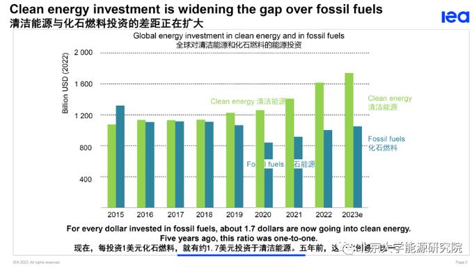 近日,國(guó)際能源署《2023世界能源投資》報(bào)告在北京發(fā)布。國(guó)際能源署首席能源經(jīng)濟(jì)學(xué)家Tim Gould介紹,五年前,清潔能源與化石能源的投資比為1:1,如今這一比例已擴(kuò)大至1.7:1。同時(shí),太陽(yáng)能領(lǐng)域的投資將會(huì)在2023年首次超過(guò)石油生產(chǎn)投資。