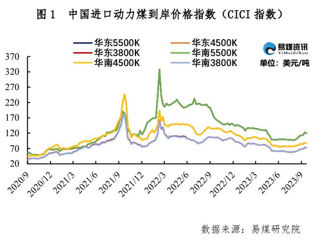截至10月20日,5500K華東和華南到岸價(jià)均為119.20美元/噸,較上期下跌3.80美元/噸,較國(guó)內(nèi)煤價(jià)低20-25元/噸;4500K華東和華南到岸價(jià)均為88.00美元/噸,較上期下跌0.10美元/噸,與國(guó)內(nèi)煤價(jià)低20-25元/噸;3800K華東和華南到岸價(jià)均為72.50美元/噸,較上期下跌0.60美元/噸,較國(guó)內(nèi)煤價(jià)低10-15元/噸。(理論測(cè)算,僅供參考)。