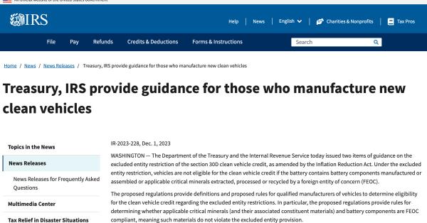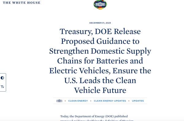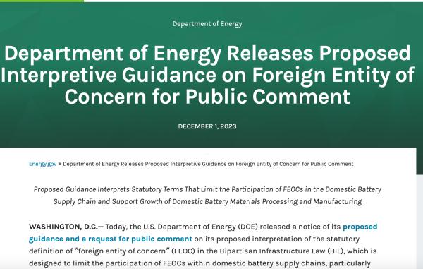 12月1日,美國能源部(DOE)發(fā)布《兩黨基礎(chǔ)設(shè)施法》中 “敏感外國實(shí)體(Foreign Entity of Concern,F(xiàn)EOC)”的解釋文件。同日,美國財政部(Treasury)和國稅局(IRS)發(fā)布了《通貨膨脹削減法》(IRA)第30D條清潔能源車輛稅收抵免相關(guān)禁令的指導(dǎo)意見。