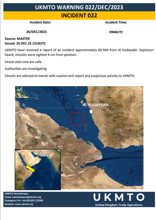 另外,據(jù)央視新聞消息,當(dāng)?shù)貢r間12月26日晚間,也門胡塞武裝發(fā)表聲明稱,在對紅海海域“MSC United”號商船三次發(fā)出警告遭拒后,胡塞武裝向其發(fā)射了導(dǎo)彈。