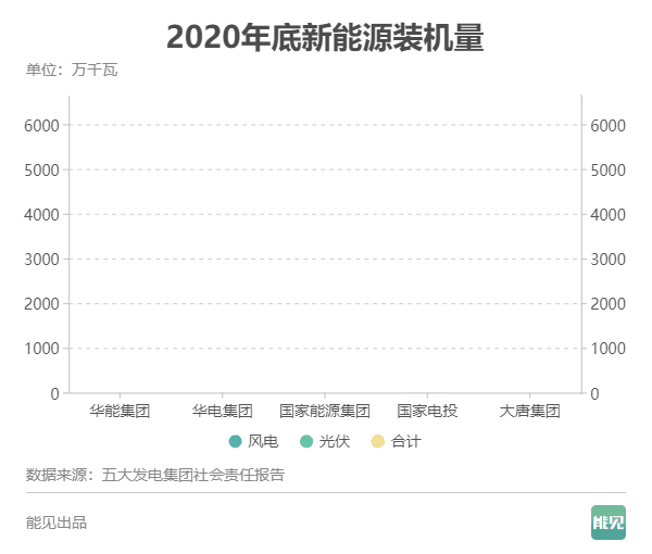 2021年是業(yè)界公認(rèn)的“碳中和元年”。實(shí)現(xiàn)“雙碳”目標(biāo),必須大力發(fā)展新能源,構(gòu)建以新能源為主體的新型電力系統(tǒng)。因此,我們也統(tǒng)計(jì)了2021年底五大發(fā)電集團(tuán)新能源裝機(jī)情況圖(華電數(shù)據(jù)缺失),另附2020年底的統(tǒng)計(jì)圖作為對(duì)比。
