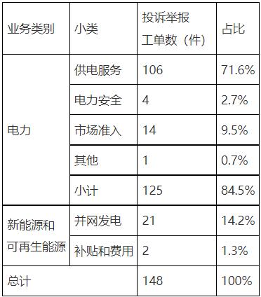 2022年9月份工單中,投訴和舉報(bào)類工單共148件,同比增加54.2%,環(huán)比減少31.5%。從反映內(nèi)容看,電力類125件,占84.5%,新能源和可再生能源類23件。具體情況見(jiàn)表6。