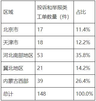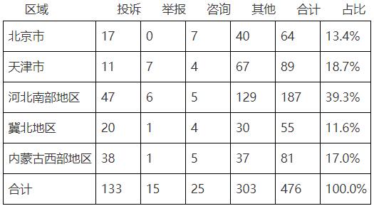 9月份投訴和舉報(bào)工單中,河北南部地區(qū)數(shù)量最多,占35.8%。投訴和舉報(bào)類工單按區(qū)域分布情況具體見(jiàn)表7。