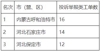 從各市的投訴舉報(bào)工單數(shù)量來(lái)看,內(nèi)蒙古呼和浩特市最多。數(shù)量前三名的市見(jiàn)表8。