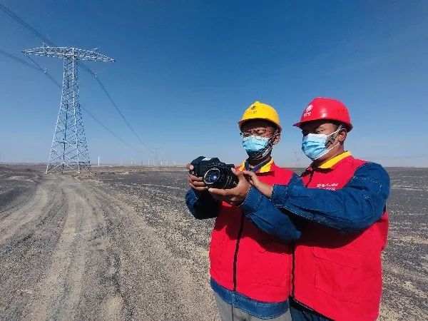 新疆送變電公司員工石浩、楊軍在±1100千伏吉泉線0339號塔開展保電巡視。蒲平 攝