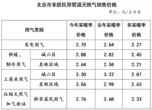 10月31日,北京市發(fā)改委對(duì)外發(fā)布《關(guān)于調(diào)整本市非居民用天然氣銷售價(jià)格的通知》。根據(jù)通知,今冬供暖季期間,北京市居民用電、氣、熱價(jià)格維持穩(wěn)定,不作調(diào)整;執(zhí)行居民價(jià)格的學(xué)校、養(yǎng)老福利機(jī)構(gòu)、社區(qū)居委會(huì)等非居民用戶價(jià)格不作調(diào)整。非居民熱價(jià)不作調(diào)整。