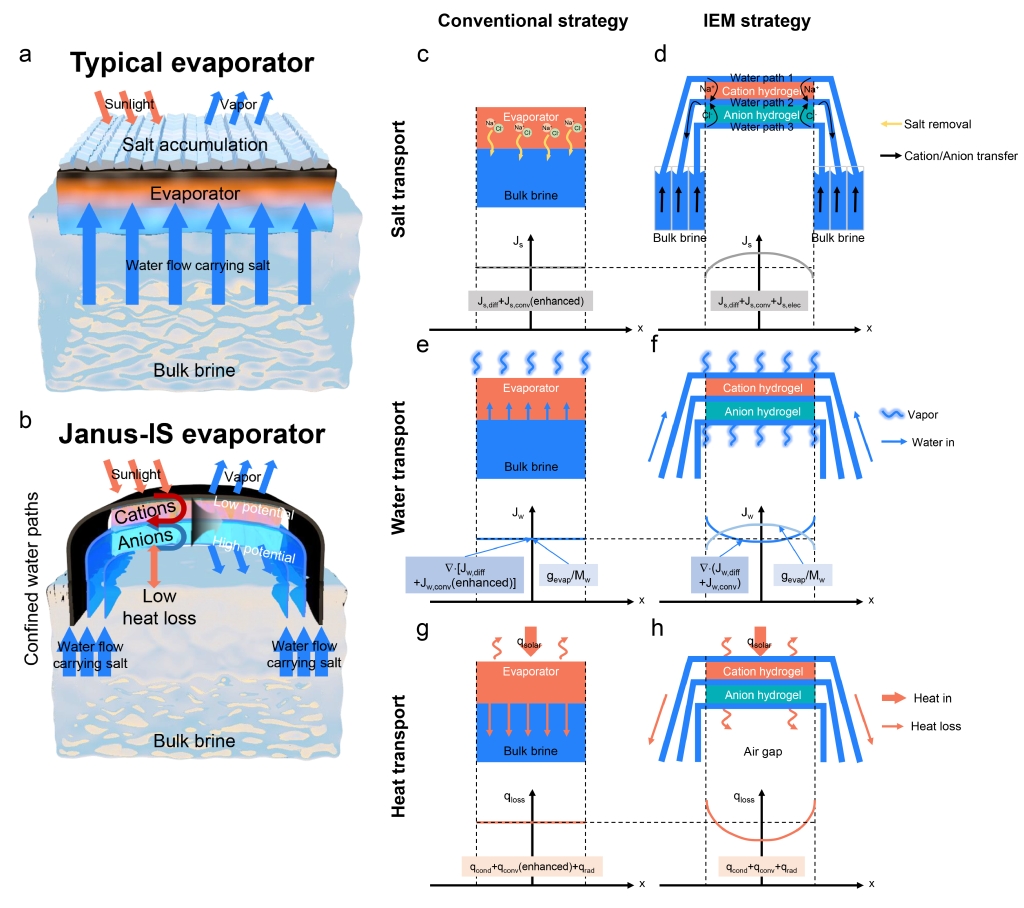 太陽(yáng)能界面蒸發(fā)是一種新興的海水淡化技術(shù),其將蒸發(fā)器漂浮于海面上進(jìn)行界面光熱蒸發(fā),具有綠色、零能耗、低成本和結(jié)構(gòu)簡(jiǎn)單等諸多優(yōu)勢(shì),有望解決全球性淡水短缺問(wèn)題。但光熱表面水汽化會(huì)造成鹽分積累,嚴(yán)重阻礙其長(zhǎng)期運(yùn)行的穩(wěn)定性。將光熱層疏水化和強(qiáng)化對(duì)流傳質(zhì)是當(dāng)前抗積鹽的主要方法。前者避免海水到達(dá)光熱層來(lái)防止積鹽,但其同時(shí)增大了光熱層與海水之間的熱阻,降低蒸發(fā)速率。后者加快水對(duì)流從蒸發(fā)表面帶走鹽分,但同時(shí)也帶走了熱量,制約蒸發(fā)速率。因此,傳統(tǒng)方法無(wú)法解決鹽離子運(yùn)移和高效熱利用之間的矛盾,積鹽問(wèn)題仍是界面蒸發(fā)所面臨的最嚴(yán)峻挑戰(zhàn)之一。