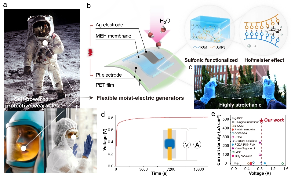為解決上述問(wèn)題,該團(tuán)隊(duì)聚焦于水凝膠聚合物材料,其不僅擁有良好的柔韌性,而且內(nèi)部具有大量的微納結(jié)構(gòu)和官能團(tuán),可吸附并儲(chǔ)存大量水分。然而,這種柔性材料的離子傳導(dǎo)率較差,難以直接用于濕電轉(zhuǎn)化。為此,該團(tuán)隊(duì)提出了一種水凝膠分子工程策略,通過(guò)在其單個(gè)聚合鏈分子結(jié)構(gòu)上進(jìn)行微觀設(shè)計(jì),顯著提高了水凝膠的離子傳導(dǎo)特性和可拉伸性。該分子工程策略是將磺酸基團(tuán)和鋰離子嵌入到聚合鏈分子結(jié)構(gòu)中。其中,磺酸基團(tuán)賦予聚合鏈更穩(wěn)健的分子結(jié)構(gòu)及電離特性,而鋰離子能夠誘導(dǎo)產(chǎn)生霍夫邁斯特效應(yīng),拓寬聚合鏈之間的間距并構(gòu)建出大量的離子傳輸通道?;诜肿庸こ趟z構(gòu)建的濕氣發(fā)電器獲得了高達(dá)480 μA cm-2的短路電流密度,是大多數(shù)已報(bào)道的濕氣發(fā)電器的十倍以上。同時(shí),其可承受500%以上的拉伸形變而不被破壞,是目前已報(bào)道的濕電轉(zhuǎn)化材料的最高水平。該濕氣發(fā)電器能夠?qū)⑷梭w呼吸過(guò)程中產(chǎn)生的濕氣轉(zhuǎn)化為電能,為電子設(shè)備提供動(dòng)力。該工作推動(dòng)了濕氣發(fā)電技術(shù)向可穿戴電子設(shè)備的應(yīng)用。