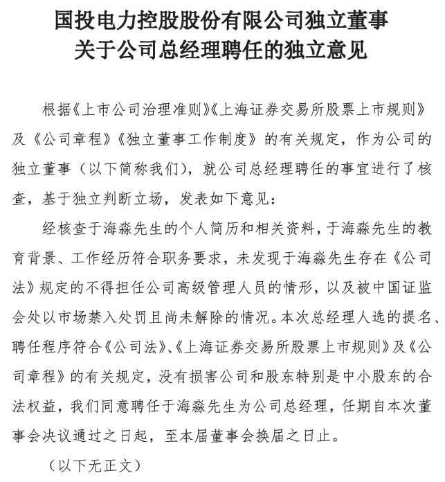 《意見》指出,國投電力同意聘任于海淼先生為公司總經(jīng)理,任期自本次董事會決議通過之日起,至本屆董事會換屆之日止。