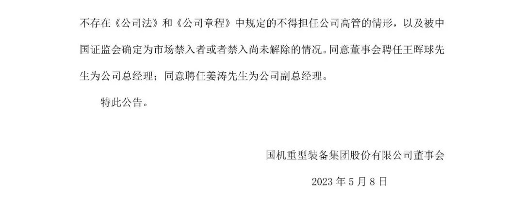 5月6日,國機重裝董事會審議通過了《關(guān)于聘任公司總經(jīng)理、副總經(jīng)理的議案》,同意聘任王暉球為公司總經(jīng)理;同意聘任姜濤為公司副總經(jīng)理。