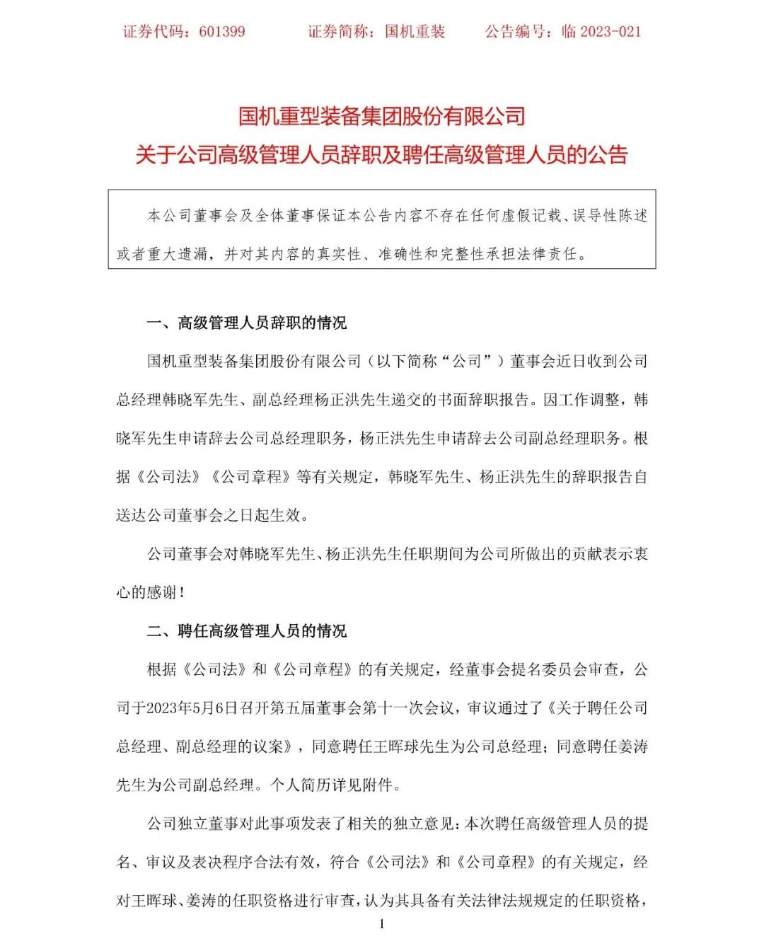 5月8日,國機重裝發(fā)布公告,董事會近日收到公司總經(jīng)理韓曉軍、副總經(jīng)理楊正洪遞交的書面辭職報告。因工作調(diào)整,韓曉軍申請辭去公司總經(jīng)理職務(wù),楊正洪申請辭去公司副總經(jīng)理職務(wù)。