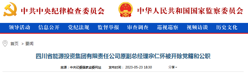 中央紀(jì)委國家監(jiān)委網(wǎng)站5月23日消息,據(jù)四川省紀(jì)委監(jiān)委消息:日前,經(jīng)四川省委批準(zhǔn),四川省紀(jì)委監(jiān)委對四川省能源投資集團有限責(zé)任公司原副總經(jīng)理宗仁懷嚴(yán)重違紀(jì)違法問題進行了立案審查調(diào)查。