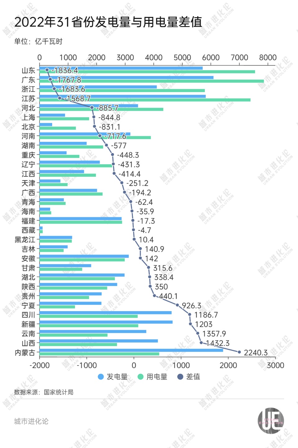 若以“發(fā)電量-用電量”來評估各省份發(fā)電凈貢獻(xiàn)和電力缺口,2022年,山東的差值為-1836.4億千瓦時,凈貢獻(xiàn)從前一年全國倒數(shù)第三跌至倒數(shù)第一。