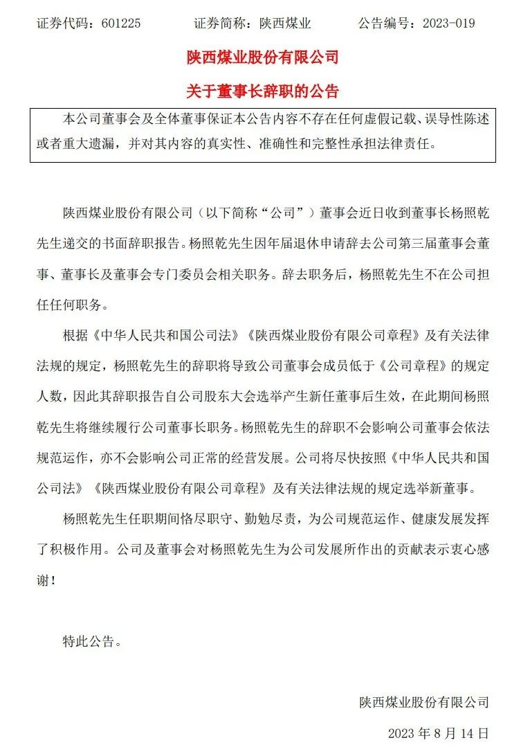 陜西煤業(yè)公告,公司董事會近日收到董事長楊照乾遞交的書面辭職報告。楊照乾因年屆退休申請辭去公司第三屆董事會董事、董事長及董事會專門委員會相關職務。