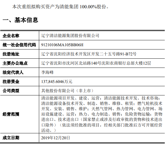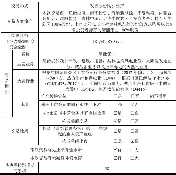 根據(jù)此前公告披露,遼寧能源擬作價18.17億元,以發(fā)行股份的方式收購遼能投資、港華投資、海通新能源等共8名投資者合計持有的遼寧清潔能源集團(tuán)(簡稱:清能集團(tuán))100%股份,并募集配套資金10億元,用于遼能康平300MW風(fēng)電項(xiàng)目、遼能南票200MW風(fēng)電項(xiàng)目、償還上市公司債務(wù)。