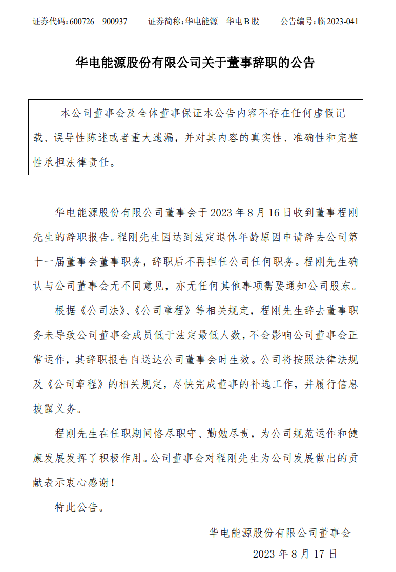 華電能源發(fā)布公告稱,公司董事會(huì)于8月16日收到董事程剛先生的辭職報(bào)告。程剛先生因達(dá)到法定退休年齡原因申請(qǐng)辭去公司第十一屆董事會(huì)董事職務(wù),辭職后不再擔(dān)任公司任何職務(wù)。