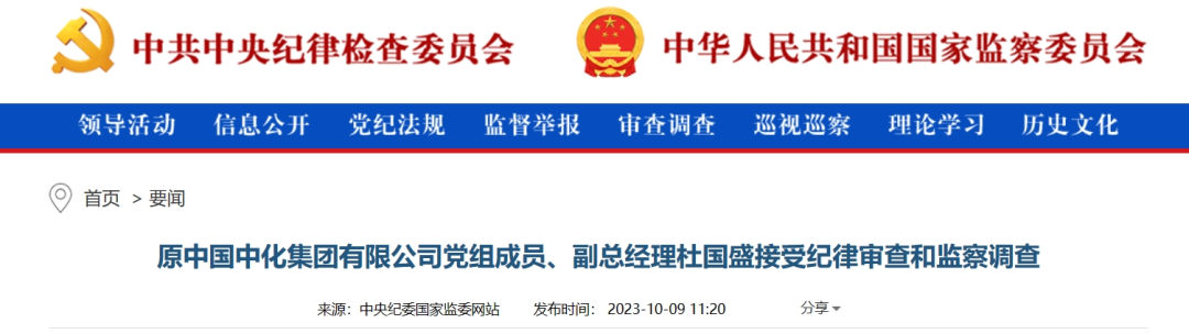 中央紀委國家監(jiān)委網(wǎng)站10月9日消息,據(jù)中國中化控股有限責任公司紀檢監(jiān)察組、福建省紀委監(jiān)委消息:原中國中化集團有限公司黨組成員、副總經(jīng)理杜國盛涉嫌嚴重違紀違法,目前正接受中國中化控股有限責任公司紀檢監(jiān)察組和福建省泉州市監(jiān)委紀律審查和監(jiān)察調(diào)查。