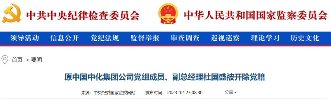中央紀(jì)委國(guó)家監(jiān)委網(wǎng)站12月27日消息,據(jù)中國(guó)中化控股有限責(zé)任公司紀(jì)檢監(jiān)察組、福建省紀(jì)委監(jiān)委消息:日前,中國(guó)中化控股有限責(zé)任公司紀(jì)檢監(jiān)察組、福建省泉州市監(jiān)委對(duì)原中國(guó)中化集團(tuán)公司黨組成員、副總經(jīng)理杜國(guó)盛嚴(yán)重違紀(jì)違法問(wèn)題進(jìn)行了紀(jì)律審查和監(jiān)察調(diào)查。